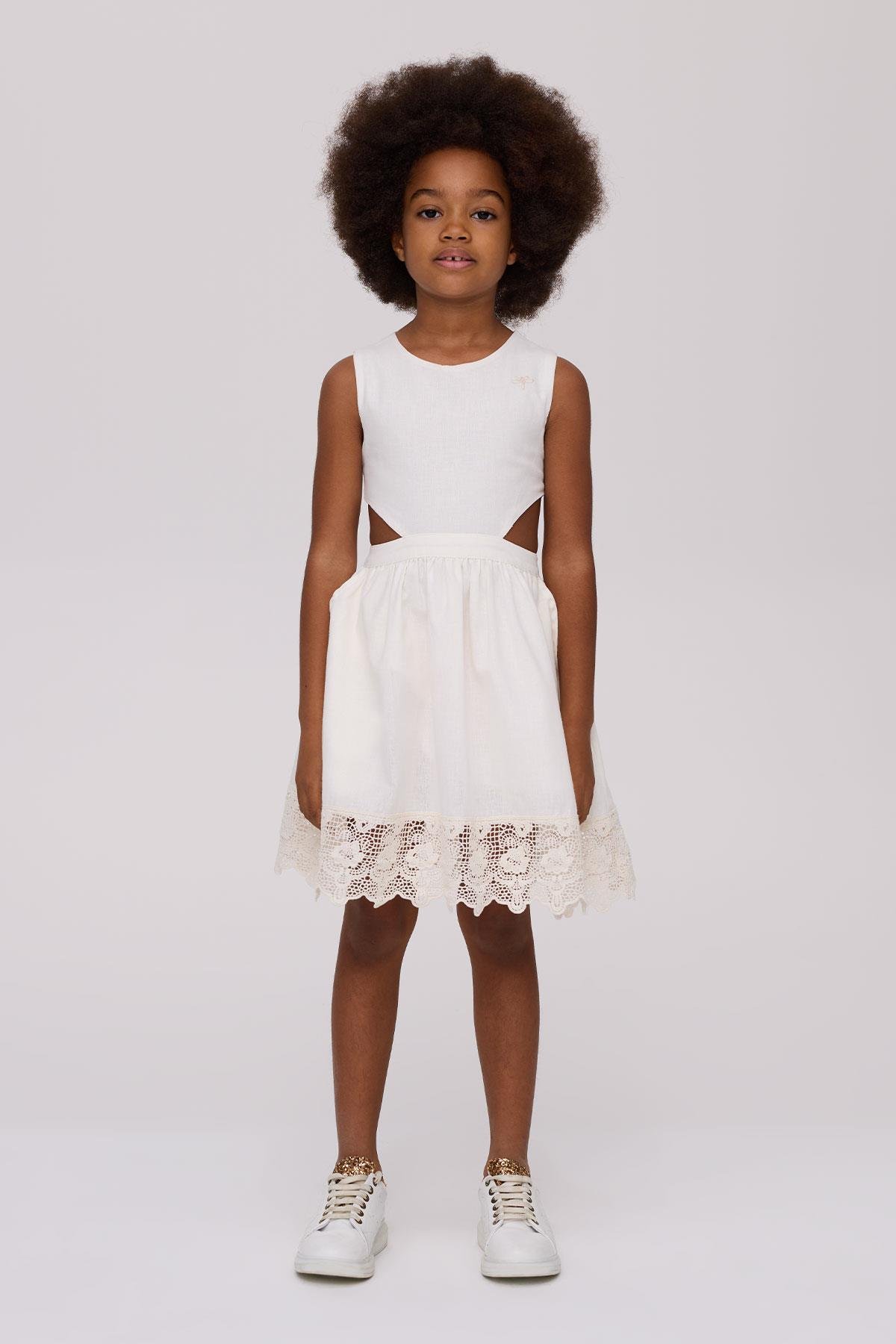 Tyess Kız Çocuk Eteği Dantelli Ekru Elbise
